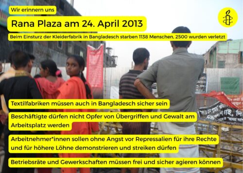 Wir nehmen das Datum zum Anlass, um im Rahmen einer Postkartenaktion fünf Unternehmen aufzufordern, nicht nur für Sicherheit bei ihren Lieferanten zu sorgen, sondern auch dafür, dass elementare Gewerkschafts- und Arbeitsrechte eingehalten werden. Die fünf Unternehmen haben wir unter anderem auf Grundlage von Informationen der Kampagne für saubere Kleidung ausgewählt (Kampagne für Saubere Kleidung | Clean Clothes Campaign Germany – Kampagne für Saubere Kleidung | Clean Clothes Campaign Germany).