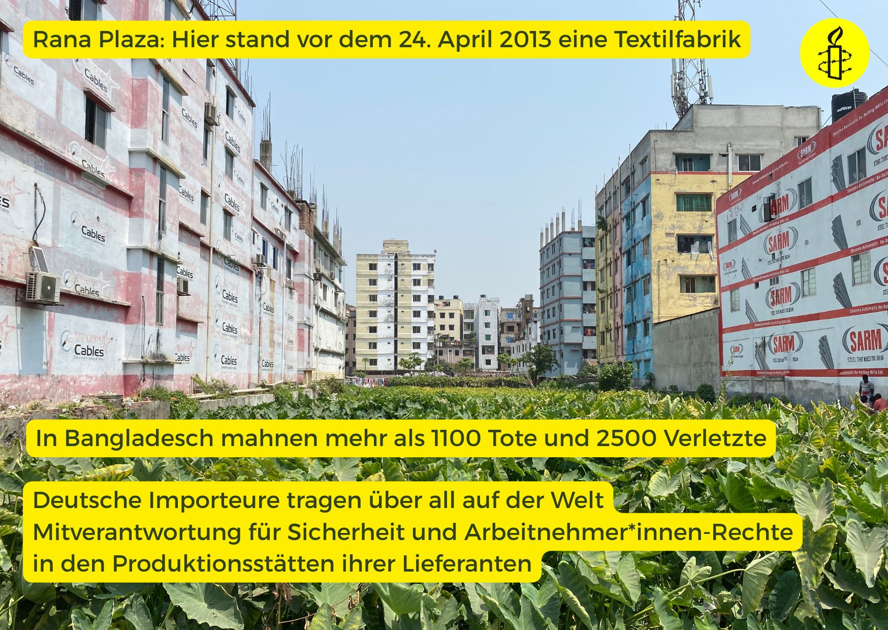 Wir nehmen das Datum zum Anlass, um im Rahmen einer Postkartenaktion fünf Unternehmen aufzufordern, nicht nur für Sicherheit bei ihren Lieferanten zu sorgen, sondern auch dafür, dass elementare Gewerkschafts- und Arbeitsrechte eingehalten werden. Die fünf Unternehmen haben wir unter anderem auf Grundlage von Informationen der Kampagne für saubere Kleidung ausgewählt (Kampagne für Saubere Kleidung | Clean Clothes Campaign Germany – Kampagne für Saubere Kleidung | Clean Clothes Campaign Germany).